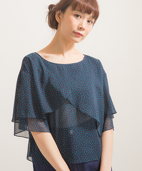 ◆2016 PRE-FALL COLLECTION◆ ふんわりと揺らぐティアードフリルが印象的なシフォンブラウス。 どの角度からみても華やぎのあるシルエットを描く、スタイリングの主役になる1枚。 大人の女性にもお勧めの甘さ控え目のドット柄は、合わせるボトムスでカジュアルダウンすればデイリーに着易くお勧めです。 カットオフデニムと合わせた、ヴィンテージライクな着こなしも今期イチオシ☆ 透け感があるのでお手持ちのインナーを着用してください。