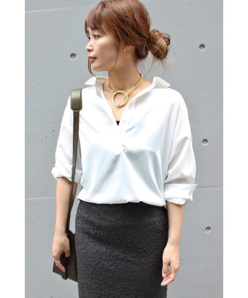 【2016AW】 FIGARO paris こなれ感のあるスキッパータイプのシャツ。 ゆったりとリラックスしたシルエットでありながら、鎖骨が美しく見えるデコルテラインに女性らしさが感じられる1着です。 程よい光沢がある素材で、トレンドのとろみ感が今年らしく決まります。 パンツにもスカートにも合わせやすく、オフィスシーンでも活躍してくれます。 ※取り扱いについては、商品についている品質表示でご確認ください。※店頭及び屋外での撮影画像は、光の当たり具合で色味が違って見える場合があります。商品の色味は、スタジオ撮影の画像をご参照ください。洗濯:手洗い可