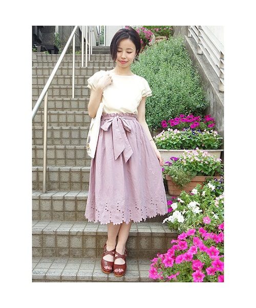 裾のフラワーカットワークが目を引くギャザースカート。 大きなリボンベルト付きでトップスインコーデにぴったりです♪ ホワイト、ブラックの合わせやすいカラーに加え、大人ガーリーなラベンダーをご用意しました。 裏地付きなので透けを気にせず着用できます◎ MATERIAL: モデル身長: 158cm 表地 コットン100% 刺繍上糸 コットン100% 下糸 ポリエステル100% 裏地 ポリエステル100% made in China サイズウエスト脇丈 Free109〜62cm72.5cm