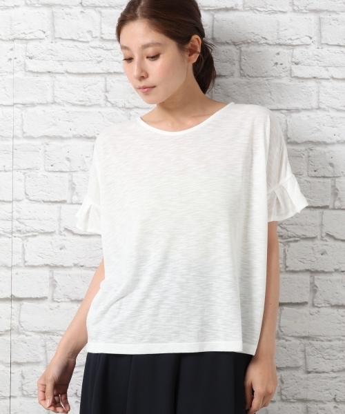 さらっとした素材が夏に気持ちいいプルオーバー。 スラブ糸がはいっているので表面感もあり、ゆったりとしたサイジングで着心地も◎ 袖のタックデザインが程よく女性らしい雰囲気を演出してくれます! フルレングスパンツはもちろん、ワイドパンツやスカートともバランスがとりやすいのでオススメです。
