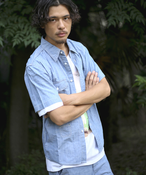 ワークシャツタイプのダンガリーシャツは 腰部分の小さいポケットがアクセント!! 古着の中でも人気の高いディテール フラップポケットを配したダンガリーシャツ。 シルエットもこの時期に着やすいラフな サイズ感が今、合したい一枚に お仕立致しております。 D16SS-571ダンガリーショートパンツは 同生地になりますのでセットアップで お楽しみ頂けるアイテムです。