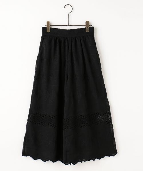 可憐な刺繍をあしらったレースでワンランク上のカジュアルスタイルへと導くスカンツ。裾に配した花びらのようなスカラップデザインが乙女心をくすぐります。シックなワントーンカラーでまとめているので着回しやすさもお墨付きです。モデル身長:169㎝
