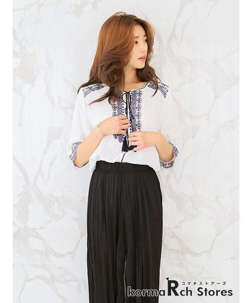 【スイートボヘミアンチュニック】襟ぐりと袖口にトレンドのボヘミアンな刺繍を施したチュニックです。細身のパンツとの合わせがおすすめ。ストラップ付でリボンに可愛く仕上げてもGOOD。