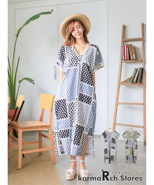【ドットロングワンピース】*デコルテを美しく見せるVネックラインインナーが見えないギリギリのところに計算されたネックラインは、鎖骨を美しく見せてくれる女性らしいデザイン。二の腕カバーのルーズシルエット