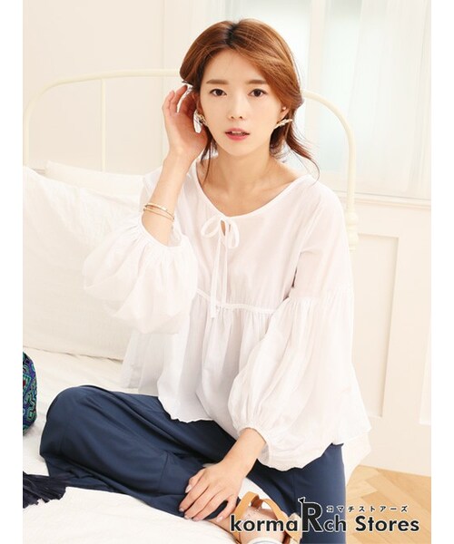【ドロップショルダーフレアブラウス】薄手で程よい光沢感のある、とろみ素材を使用。スキッパー仕様のネックデザインで抜け感を演出してくれます。タックインしてワイドなボトムとのゆるスタイリングがおすすめです。