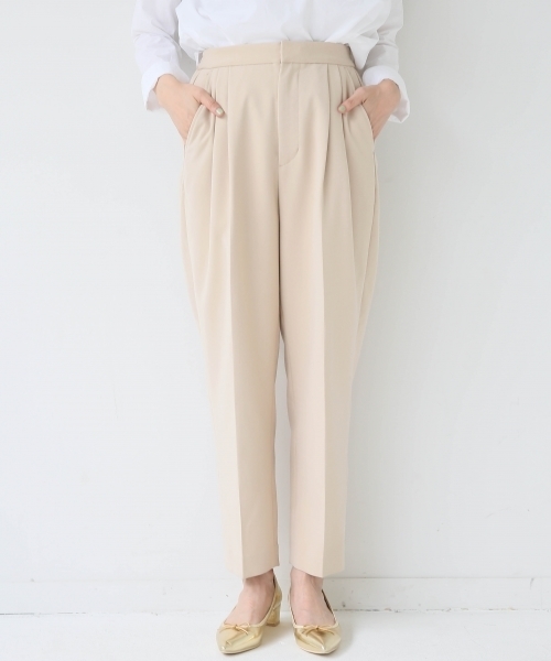 キレイ目素材で仕立てたタック入りパンツ。 メンズライクな着こなしにハマるように 腰ではいたこなれ感を楽しんでいただくのがオススメ。 タックが入っている分、ボトムスラインがワイドパンツに似た印象が面白いアイテムです。 ウエストはフロントはきちんとした印象にしつつも 後ろはゴムにし、はきやすく仕立ててあるので トップスインなどニュアンスのある着こなしがしやすいパンツです。 タック入りとセンタープレスでメンズライクなデザインと 柔らかい雰囲気のカラーバリエーションで 甘さもプラスされているところが◎
