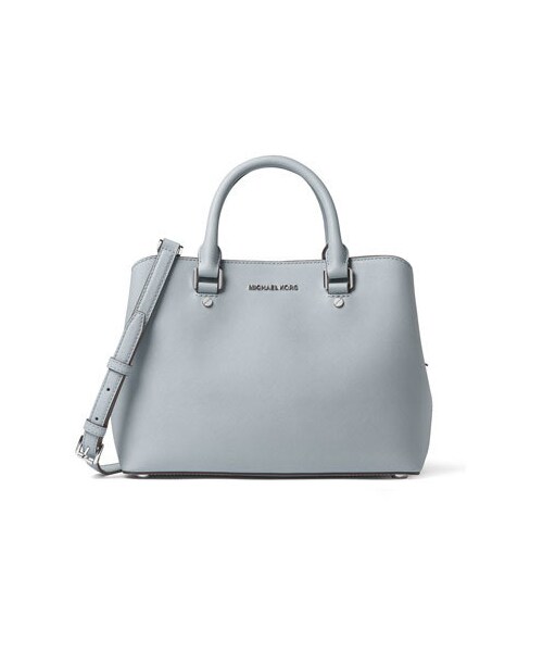 MICHAEL Michael Kors structured satchel bag in saffiano leather. Rolled top handles with square rings, 4" drop. Adjustable, removable shoulder strap, 21-24" drop. Open top with magnetic snap closure. Logo lettering and screw-heads at top center. Zip-through center compartment divides interior. Inside, logo jacquard lining; four open pockets; key clip. Feet protect bottom of bag. 8.5"H x 12.5"W x 5"D. "Savannah" is imported.