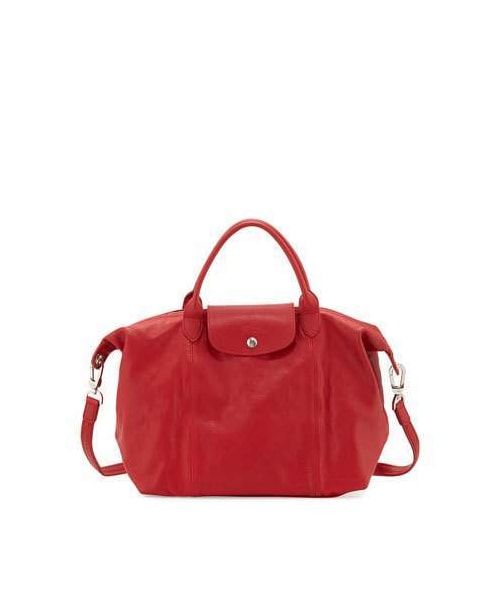 Longchamp leather tote bag with silvertone hardware. Rolled top handles; 4.5" drop. Detachable shoulder strap; 20" drop. Zip top with signature racehorse medallion. Snap flap front. Inside, jacquard lining; one zip and two slip pockets. 11"H x 12.5"W x 6"D. "Le Pliage Cuir" is imported.