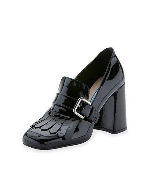 Prada burnished patent leather loafer. 3.3" covered block heel. Round moc-stitched toe. Buckle strap with kiltie detail. Tonal topstitching. Leather lining. Slip-on style. Made in Italy.