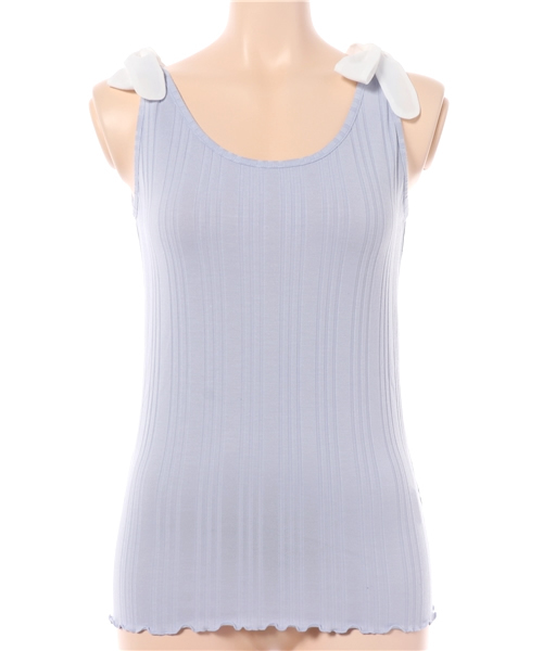 シフォンの肩紐を結ぶタイプのタンクトップ。 オフショルがトレンドの今季、肩からチラリと見せるタイプのインナーが人気です♪ リボン部分はほどけるのでお好みの長さに調節可能。 柔らかいテレコ素材で着心地も抜群です。