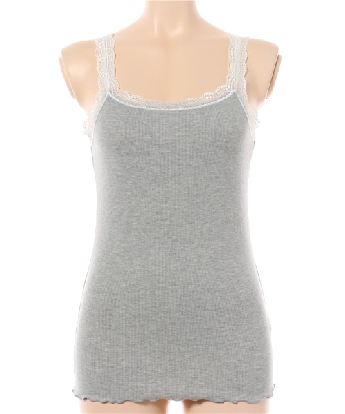 ランジェリー風のレースをあしらったフェミニンなタンクトップ。 デコルテのあいたトップスと併せて肩のレースを見せてもよし、シャツなどを上から羽織ってトップスとして使ってもよし…と、使い勝手のよいインナーです。 透け感を気にせず使えるグレー・ブラックの2色をご用意しました!