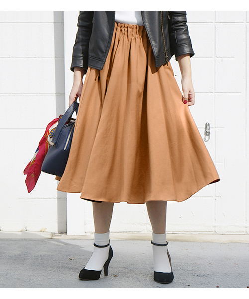 ◆コーディネートし易いウエストタックミディスカート◆春から人気だったウエストタックスカートの素材を秋冬を通し着用出来るT/R素材にし新登場。レングスを春夏よりも6cm長くし、アンクルブーツなどにも合わせやすい着丈に変更しました。程良いボリュームのスカートは様々なコーディネートに使っていただけます。ウエストをアウトにしてもキレイに収まるデザインはウエストゴムで履き易いのが嬉しいポイント! スニーカーとも相性抜群ですが、レディライクにパンプスに合わせても◎ ドラマティックなフレアスカートは通年人気商品で、秋はライダースジャケットやノーカラージャケット、 冬はコートやコーディガンに合わせて。春はGジャンに合わせて着ていただけるアイテムです。 トレンドにも左右されないベーシックなデザインなので、色違いで買われる方も多く、 通年大人気のアイテムです。 裏地つきなので静電気も起こらず安心です。