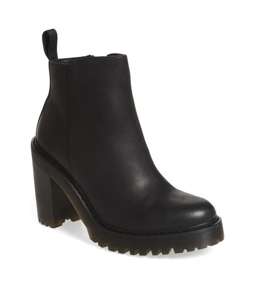 A lugged platform sole adds signature toughness to a lofty bootie shaped from sleek, matte leather. 4" heel; 1" platform (size 9US). 4" boot shaft. Side zip closure. Leather upper/leather and textile lining/rubber sole. By Dr. Martens; imported. BP. Shoes.