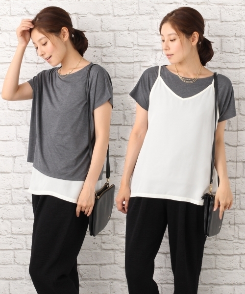 Tシャツとキャミソールのお得な2枚セット。 こちらのキャミソールはなんと、インにもアウトにも使える優秀なアイテムです。 どちらもシンプルなデザインなので、お手持ちのアイテムと合わせたり 幅広いスタイリングが楽しめます。