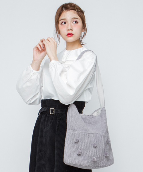 merry jenny(メリージェニー) 共糸のぽんぽんがフロントポケットにたくさんついたトートBAG。ニット素材ですが、肩紐が伸びにくい仕様になっています。