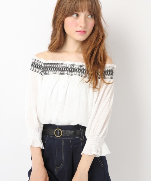 この秋もボヘミアンテイストなアイテムは人気!刺繍を施し雰囲気のある一着に仕上がりました。シワ感のある楊柳生地を使用しており、レーヨンのさらりとした肌触りが心地いい♪ネック周りは柔らかいゴム仕様で、オフショル・ボートネックの2パターンの着用が可能です。また、前後どちらでも使えるので違った印象を楽しめますよ!※オフ、レッドはオフショル、ネイビーはボートネックで着用しています。