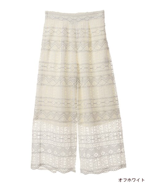 幾何柄のレースがおしゃれなパンツ。裾がさりげなくスカラップになっているのもポイント。裏地が少し短めでレースの透け感が涼しげな印象です。レースでも幾何柄なので甘くなりすぎず、大人っぽく着ていただけます。落ち着いた色のトップスとあわせれば秋口もお使いいただけます。左側にファスナーがつき、ウエスト後ろにゴムが入るので着脱もしやすくて◎。※同柄でトップスもあります。セットアップで着るのもおすすめ。
