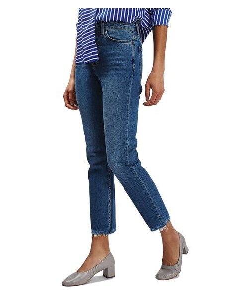 Raw, ankle-length hems define the carefree style of mid-rise straight-leg jeans cast in medium-wash stretch denim. 26" inseam; 13" leg opening; 11" front rise; 15" back rise (size 28 x 30). Zip fly with button closure. Five-pocket style. 99% cotton, 1% elastane. Machine wash warm, dry flat. By Topshop; imported.