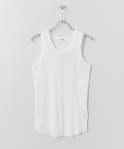 「針抜き」と呼ばれる、部分的に針抜きすることでストライプ柄を表現したタンクトップ。凹凸のあるワッフル素材は伸縮性も高く、程よいフィット感でお召いただけます。ラウンドカットされた裾がトップスから覗きレイヤードスタイルを完成させます。