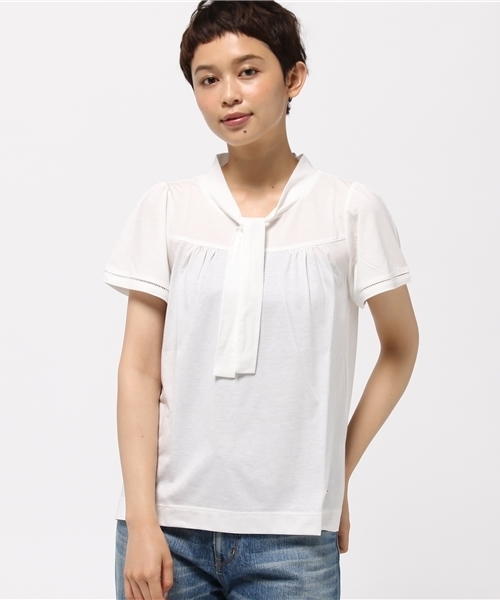 ボウタイ付きのレトロなカットソープルオーバー。 上品な光沢と適度なドレープ感が特徴の女性らしい素材を使用。 さらっとした肌触りで着心地抜群です。 袖のレース使いが涼しげな印象。 きちんと感があり、スカートにもパンツにも合わせやすいカットソーは この時期大活躍の1枚です。