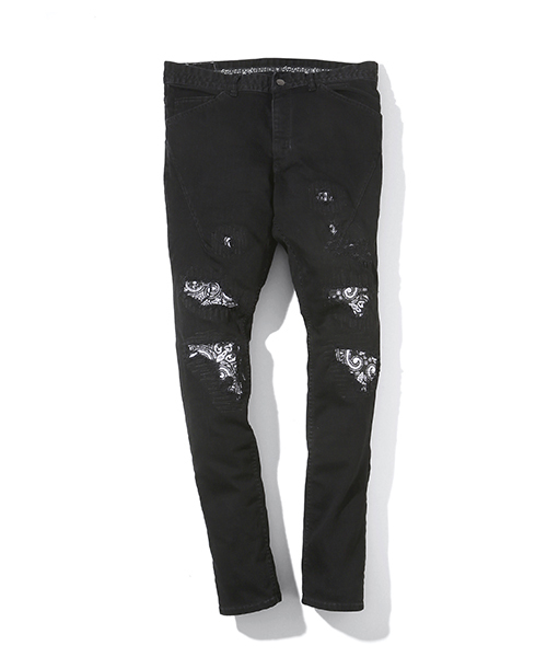 n(n) BY NUMBER (N)INE/エヌエヌ バイ ナンバーナイン 直営店限定アイテム(EXCLUSIVE)_TAPERD PANTS_STRETCH DENIM(DAMAGED_BANDANA) リペア&ダーメージ加工を施したストレッチデニムを使用したテーパードパンツです。 ブランドが誇るシルエット、パターン、アイコニックなダーツや音符テープを残し クロスカンヌキをなくしディテールをよりシンプルにしたタイデニム。 アイコニックなオリジナルバンダナ柄の生地を使用したリペア&ダメージ加工を施した デニムは随所に拘りを感じられこれ1本でコーディネートの主役になります。 腰回りから腿にゆとりをもたせ膝から裾にかけてシェイプされた 奇麗なテーパードシルエットが特徴的なオススメの1本です。 このシリーズには、ホワイトの音符柄をデザインした革パッチを採用! ※手に取りやすい価格を実現したMADE IN THAILANDのデニムパンツです。 ※画像はサンプルになります。 実際の商品と仕様、加工、サイズが若干異なる場合がございます。 デニム加工の特性上、一点一点風合いやダメージ加工の部位が異なりますので、ご了承をお願い致します。