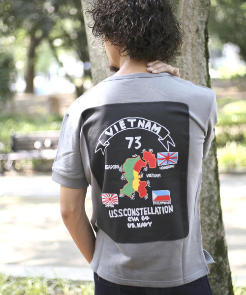ミリタリージャケットのスーベニアジャケットを ベースにバックプリントを施した半袖スウェットが登場! 程よい肉厚さで着心地が特に良い 触り心地の1着に刺繍での表現とは 一味違ったお作りの1着。 単品一枚でお使い頂いても インパクトも出せますのでシンプルに なりがちなこの時期に 是非お勧めの一枚です。 イージーパンツや、ショートパンツ等の リラックススタイルとも相性良く スタイリングして頂けます。
