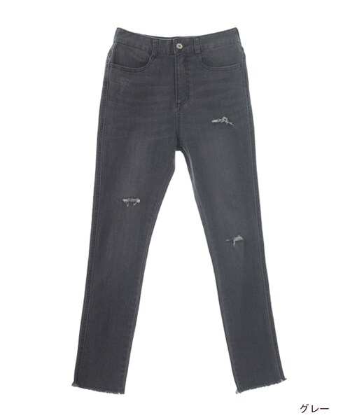 1本は持っていたいスキニーパンツ。今年は裾がフリンジ加工になっていたり、ダメージがついているなどの加工されているタイプがオススメです。前後にブラスト・ヒゲ加工が入っていてこなれ感があります。ストレッチがきいているので足をすらりとキレイに見せてくれるのも◎。ゆったりとした大き目のトップスにあわせるのが今年らしくてオススメ。