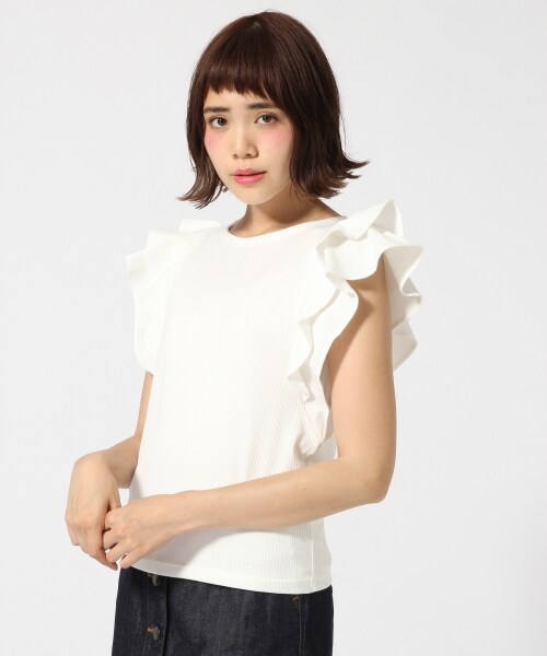 フリルが可愛いデザイントップス☆凹凸のあるテレコ素材が可愛いデザインカットソー。袖がフリルになっていることでフェミニンなイメージで女性らしく着て頂けます☆お袖は短いですが、フリルによって気になる二の腕もカバーできるのが嬉しいところ♪ガーリーな印象ならスカートで。カジュアルに着たい時はデニムやワイドパンツでも合わせて頂けます!