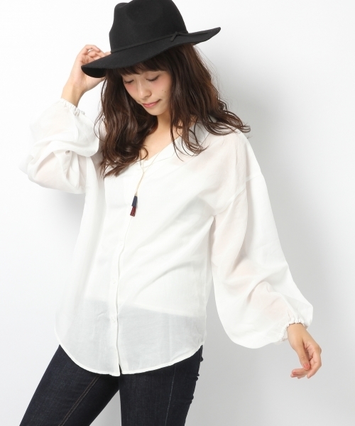 【WEB限定価格】 丸みのあるバルーン袖がフェミニンなシャツ。 スキッパー風のデザインで、大人っぽ過ぎず女性らしい雰囲気で着ていただけます。 薄手でやや透け感があるので、インナーにこだわって着用しても可愛いですよ♪ 襟のディテールにもこだわり、前から見ても後ろから見てもオシャレなアイテムです!