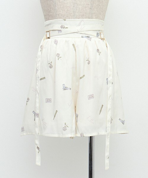 今季Crayme,のコンセプト“rose bullet=薔薇と弾丸”をテーマに制作した、完全オリジナル柄のクロスベルトキュロット。きれいなものには棘があるように、女の子の気持ちはいつだってウラハラ。甘いロマンを守るために、少女は銃を持ち戦う。相反するようで常に共存しているスピリットを、銃と弾丸、薔薇とカセットテープをモチーフに表現しました。 Aラインのシルエットでスカートのように見えながら、ゴールドバックルから垂れるベルトで毒っ気もひと匙。唯一無二の存在感を纏って。