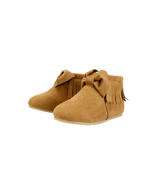 真ん中についた大きなリボンがなんとも可愛らしいフリンジブーツです。お子さま一人でも履けるよう、履き口はゴム仕様になっております。秋冬ならではのスウェード素材を使い、カジュアルから少しお出かけスタイルまで幅広いシーンで使って頂けます。