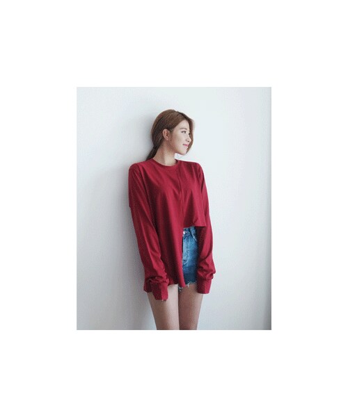 伸縮性のあるコットン素材を使った長袖シャツです。 ロング丈xクロップド丈のアンバランスな丈感のデザインがとても可愛いです! 人気のルーズなTシャツで体型カバーばっちり!デニムとの相性も抜群!