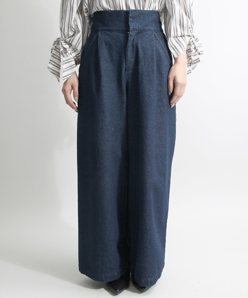 タックが入りキレイ目な着こなしもできるスーパーワイドのデニムパンツ。デニム素材ですがカジュアル過ぎずモードなスタイルにも合わせやすいひと品です。 ※実際の商品と仕様、加工、サイズが若干異なる場合がございます。