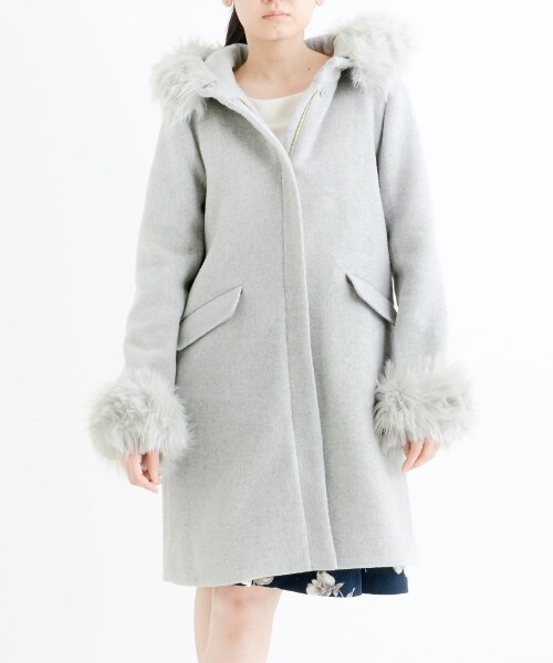ふんわりフェイクファーとふっくら大きなフードがCuteなコート☆しっかり厚みのあるメルトン地のあったかなコートで、淡いカラーで女の子らしさをアップしてくれます♪ストライプ柄の裏地で内側までカワイイ、ヘビロテ間違いなしのアイテムです!*摩擦や水濡れによる色落ち・色移りにご注意下さい。*素材の特性上、ピリング(毛玉)が生じますのでご注意下さい。*この製品は人工毛皮を使用しております。
