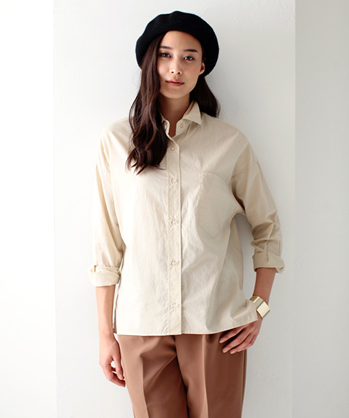 マニッシュな雰囲気ながら、ドロップショルダーとドルマンデザインがこなれた雰囲気をかもし出す長袖シャツです。前後差を設けたヘムライン、胸元のビッグポケットなど、随所にこだわりを散りばめました。フロントの裾をインすれば旬のコーディネートが即完成します。