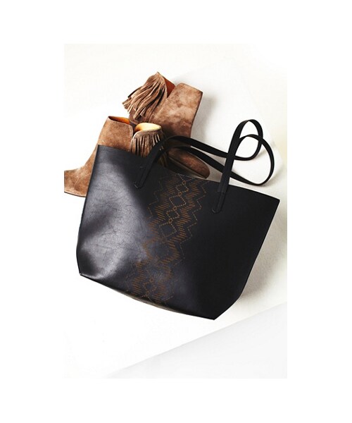 The perfect sized lightweight vegan leather tote featuring a tribal inspired subtle etched design on the front. Inside has a slip pocket. Magnetic closure.