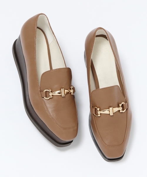 高めのソールでボリュームを持たせたビットローファー。 ビットとスクエアオフのトゥがデザインポイントです。 またアッパーとソールを配色カラーでまとめる事で足元のアクセントにしています。 合わせるボトムスはワイド、スリムどちらも相性抜群です。