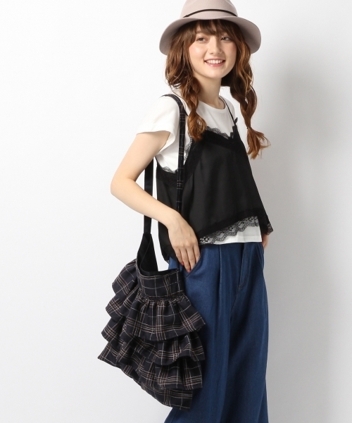 大人気のフリルショルダーが秋らしくバージョンアップ!! 2,900円+税のプチプライスはそのままに、ベージュ・ネイビーチェックが仲間入り。 ブラックとベージュの表地には「ピーチ起毛」素材を使用し、触ると少し起毛していて秋らしくなりました★さりげないHeatherロゴにも注目ですよ♪ サイズはフリルショルダー1と同じなので買いそびれた方、違う色をお探しの方はぜひチェックしてくださいね!