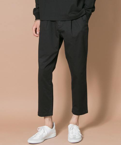 タックを入れることによりドレープ感のある、ワイドシルエットのテーパードクロップドパンツ。 短すぎない8分丈にレングスを設定することにより、スタイリッシュなトップスとも相性は抜群。 ストリートなテイストにモードなエッセンスを加えた、オールシーズン鉄板と言えるボトムです。 ※伸縮性あり