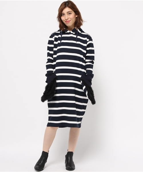 コットン100%の裏毛にボーダー柄をプリントしました。 ファーと裏毛のドッキングはメルシーの定番のあったかアイテムです。 コーディネートしやすいベーシックな色展開です。ファー部分は両色ともブラックでまとまりがあり、季節感を感じさせてくれます。