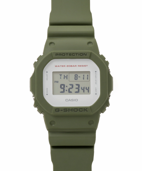 アメリカンラグシーセレクトアイテムです。 タフネスを追求し進化を続けるG-SHOCKから、ファッションの定番、ミリタリーカラーをベースにしたNewモデルが登場。 ミリタリーファッションアイテムで用いられるカラーを代表するカーキを採用。文字板にホワイトを組み合わせ、シンプルですっきりとしたデザインに仕上げました。 ベースモデルには、スクエアフォルムのDW-5600を採用。 ベゼル・バンドは落ち着いたマット素材を用い、ミリタリーテイストでありながらコンテンポラリーなデザインに仕上げました。 カジュアルファッションシーンで幅広く活躍するNewモデルの登場です。 仕様 耐衝撃構造(ショックレジスト) 無機ガラス 20気圧防水 ケース・ベゼル材質: 樹脂 樹脂バンド ストップウオッチ(1/100秒(00'00"00~59'59"99)/1秒(1:00'00"~23:59'59")、24時間計、スプリット付き) タイマー(セット単位:1秒、最大セット:24時間、1秒単位で計測、オートリピート) マルチアラーム・時報 フルオートカレンダー 12/24時間制表示切替 ELバックライト(残照機能付き) 報音フラッシュ機能(アラーム/時報/タイマー連動発光) 精度:平均月差±15秒 電池寿命:約2年 サイズ(H×W×D)/質量:48.9×42.8×13.4mm/53g EL:ブルーグリーン 101-CSO-DW-5600M-3JF
