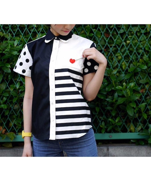 モデルはXSサイズを着用 ◆サイズXS 着丈63.5cm身幅52cm肩幅38cm袖丈20cm ◆サイズ S 着丈69cm身幅51cm肩幅42cm袖丈23.5cm ◆サイズ M 着丈69cm身幅53cm肩幅42cm袖丈23.5cm ◆サイズ L 着丈74cm身幅56cm肩幅43.5cm袖丈23.5cm ◆混率 綿 100% 【商品説明】 ラブレターシャツの新色が登場。 モノトーンの配色でパンツは選ばずコーディネートできます。 ドットとボーダーの切り替えが個性的で襟や背中にモクモクしたデザインが入っております。 長袖希望の方は、以下のURLよりシャツとは別に1つカートに入れて頂き、ご注文をお願いします。 http://nirameco.net/items/548d09fa86b188d138002f3c 備考欄に『長袖希望』とご記入下さい。
