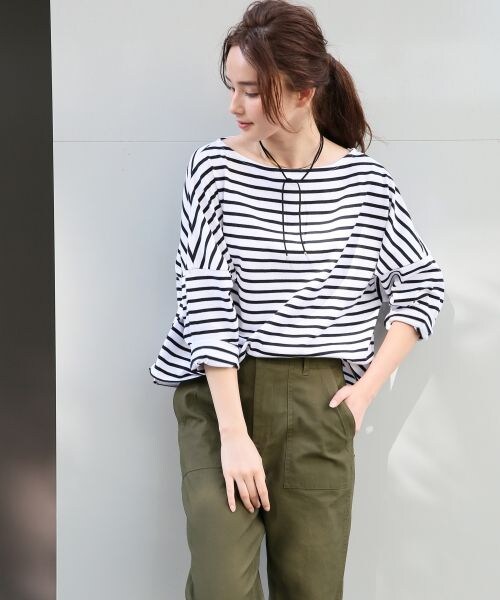 太めの袖で着丈が短めのボーダートップス。袖はラフにまくってカジュアルに楽しむ着方がオススメ。ゆとりのあるシルエットはふとした動きでも立体的なシルエットが出て印象ある着こなしが実現します。