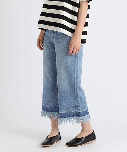 『世の中の流れを気ままに楽しむ・・・。Spots(スポッツ)はそんな感覚を大切にしながら企画しました。studio CLIPのスタイリングにピリリと効かせるペッパーのようなアイテムです。』裾のフリンジと濃淡カラー、そしてダメージ加工が魅力的なコーディネートの主役になれるデニムパンツ。柔らかな生地で動きやすく、リラックスな履き心地です。裾広がりのフレアシルエットとややハイウエストなデザインや、大胆な濃淡のカラー加工と裾フリンジでトレンドを抑え、シンプルなTシャツと合わせただけでも様になるこだわりのデザインです。レース付きのブラウスやキャミソールアイテムなど、レディライクなスタイリングもおすすめです。