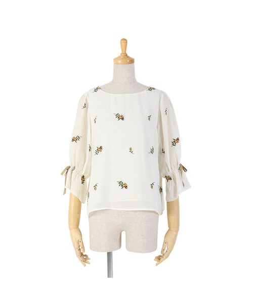 プチローズの刺繍が施されたシフォンブラウス。 小さめのローズ刺繍が可愛らしくも、甘すぎない印象です。 長めのパフスリーブに添えられたリボンがロマンチックな雰囲気♪ 秋ムード漂うカラー展開が、大人っぽく見せてくれるポイントです。 MATERIAL: モデル身長: 150cm 表地 ポリエステル100% 刺繍糸 ポリエステル100% 裏地 ポリエステル100% made in China サイズ着丈胸囲肩幅袖丈 Free55cm96cm33.5cm42cm