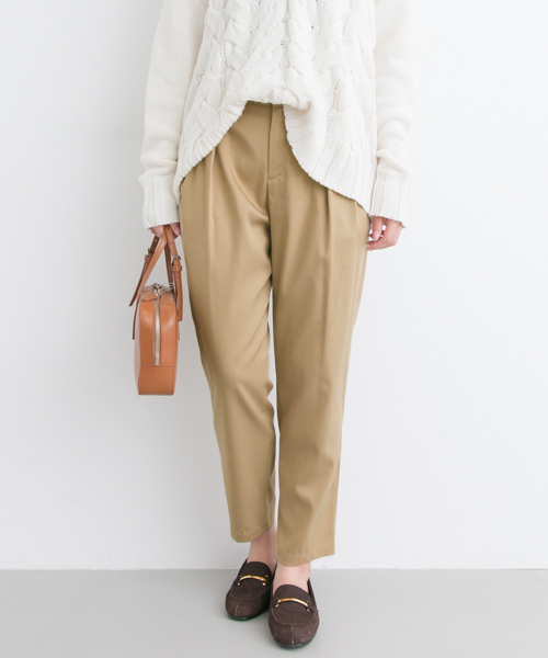 昨シーズンも人気のテーパードパンツの新型が入荷致しました。タック使いが腰回りをスッキリ見せ、テーパードの効いたシルエットは美脚効果もございます。 ストレッチの入った生地感で動きやすく、お仕事使いもしやすいON・OFF対応パンツです。 ※伸縮性あり ※この商品は、素材の特性上、雨や水に濡れると、縮んだり波打った状態になりますので、お取扱いの際はご注意ください。 また、濃色品は着用や洗濯などの摩擦により、他の衣類への色移りや、毛羽立つことがあります。 ※その他お取り扱いに関しましては、商品に付属のアテンションタグをご確認の上、充分ご注意ください。