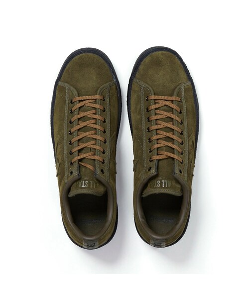 ヴィンテージに造詣の深いデザイナー今野氏にこだわりが凝縮されたスペシャルコラボレーションシューズがリリースされました。 実際にCONVERSE社が当時、米軍へトレーニングジムシューズを納入していた実績も考慮しNEXUSVII.らしくもある『ミリタリーオフィサーGYMシューズ』というコンセプトでデザイン。 表面全体の素材には上品さのある毛足の短いスウェードを採用し、メタルアイレットは40年代のミリタリートレーニングシューズで採用されていたブラックラッカー仕上げのものを採用。 モデルベースである「シェブロン&スター」と称されるこのモデルの最もシンボリックなパーツの1stモデル仕様での復刻を実現し、中でも『スター』に並ぶ『シェブロン』と呼ばれる『くの字』型のパーツの形状は誕生した翌年にはマイナーチェンジしたが1976年に初リリースされたPRO LEATHERの1stモデルの頃の『シェブロン』を復元し、これまでのCONVERSE史上にない、いわゆる『一筆書き』でのステッチワークにて『スター』を留めるなど細部にまでこだわりぬいた珠玉の逸品となります。