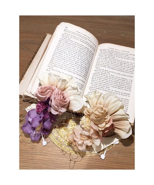まるでドライフラワーのような、アンティーク感漂うヘアクリップ。 お花に添えられたゴールドのチュールが、より一層繊細なムードを高めてくれます。 付ける部分がクリップになっているので、ヘアアクセとしてはもちろん、お手持ちのお洋服やバッグにつけられるのも◎ 存在感のあるデザインで、コーディネートのアクセントになってくれそう♪ MATERIAL:ポリエステル,合金 made in Japan サイズモチーフ(縦x横) Free約8x10.5cm