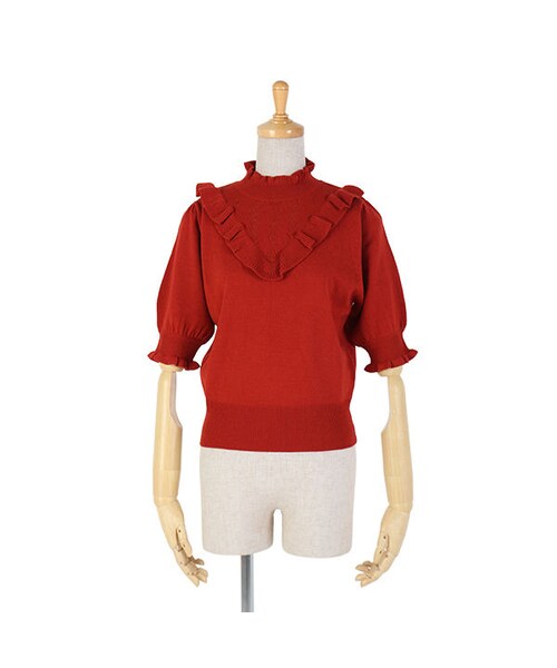 ヨークや衿、袖口にフリルがたっぷりあしらわれたニットプルオーバー。 ヨーク部分の透けのある編みが目を惹きます。 5分袖になっているので季節の変わり目に大活躍の予感♪ スカートと合わせてガーリーな甘めコーデがオススメです MATERIAL: モデル身長: 158cm アクリル100% made in China サイズ着丈胸囲肩幅袖丈 Free52cm90cm33.5cm32.5cm