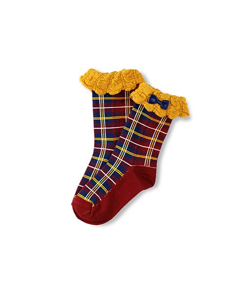 サテンリボンが付いたチェック柄クルーソックスです。様々な色の糸が混じりあいギフト映えする1点です。〈br〉9-18cmまでの展開となっております。足裏部分、9-15cmは滑り止めゴム使用。16-18cmはロゴ転写となっております。